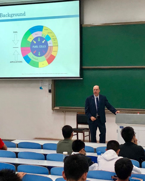 在讲座中,Alan Fuchs教授首先介绍了他和他的团队,他涉猎化学、生物、计算机等多个领域,主攻新能源材料的研究。之后,他向同学们隆重介绍了燃料电池,讲解了它的反应机理及性能优势,相比于传统的汽油,它的转换效率更高且更环保。Alan Fuchs教授指出:燃料电池会在未来的新能源领域发挥重大的作用,在加州,电动汽车穿行在大街小巷之中,已经是人们生活中的一部分。随后,他还简单讲解了有机材料的分子式、电负性等有关知识,以及他和他团队的最新科研成果,为同学们展示了新能源材料的奥秘。