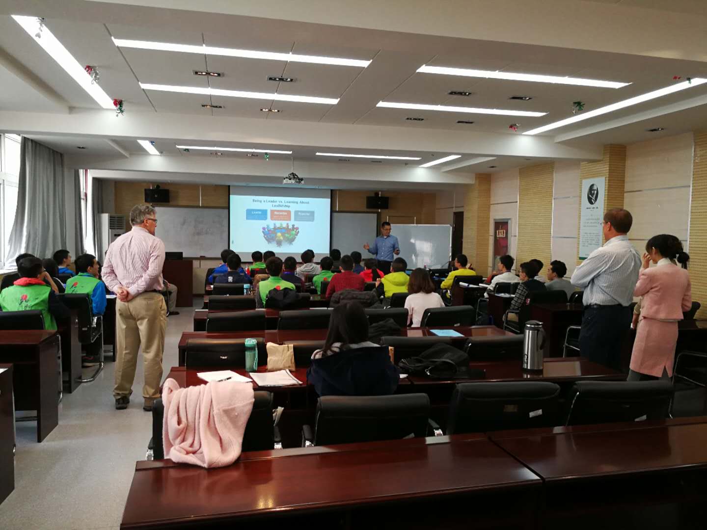 Leadership(领导力)课程团队由4位拥有数十年企业管理经验的高管担任主讲教师(Russell Frank, Greg Williams, Bruce Brownlee, Jack Sun),他们近一年来为清华大学、天津大学、东南大学等多所国内知名大学讲授Leadership课程,并不断对课程形式及内容进行完善。学校高度重视学生领导力教育,始终把课程建设作为培养工作的重要组成部分。www.28-365365.com积极发掘国外资源,精心筛选,开课前与授课团队充分沟通,根据学生特点,“量身定制”培养方案。同时将社会主义核心价值观教育植入课堂,认真进行了课程内容分析、时间编排及宣传、条件保障等工作。